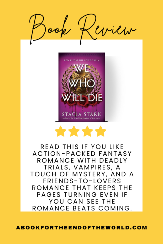 Read We Who Will Die if you like action-packed fantasy romance with deadly trials, vampires, a touch of mystery, and a friends-to-lovers romance that keeps the pages turning even if you can see the romance beats coming.