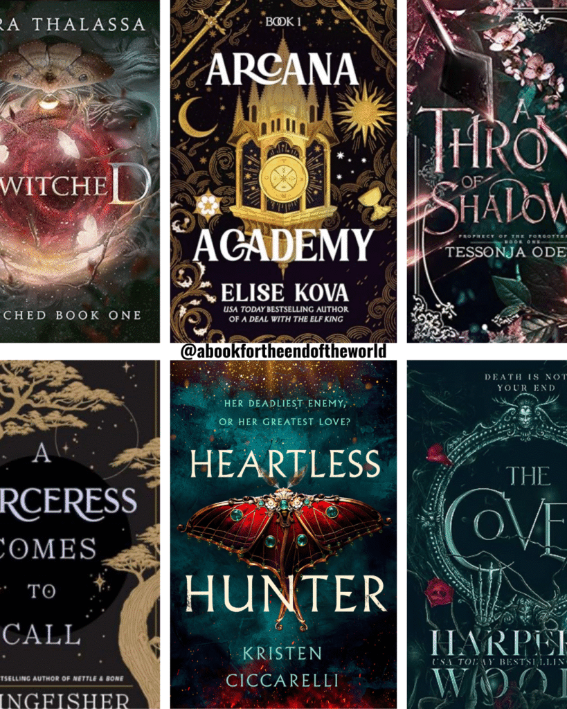 - Arcana Academy by Elise Kova – Witches-in-training battle secrets and shadows at a school where tarot magic is everything.